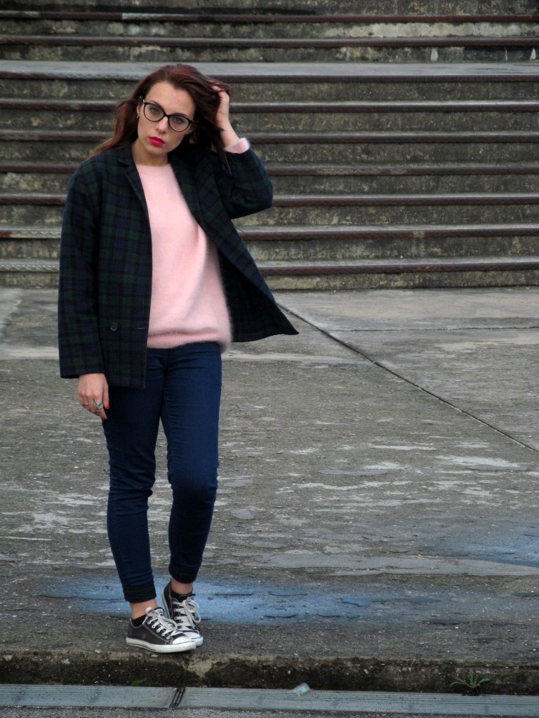 Love how casual and effortless this is. You look so insanely good in glasses and that plaid blazer with the pink jumper is perfection.http://anni-dot-elle.blogspot.com